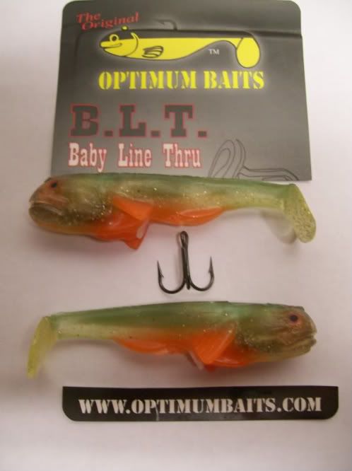 I received an Optimum package to test and review. I enjoy trying new baits so I was pretty excited to test and review one I haven’t thrown too often, a swim bait. In my package were 2 Baby Line Thru (B.L.T.) swim baits in (#505) sunfish color, three inches long, with a number 3 Eagle Claw Laser Sharp treble hook.